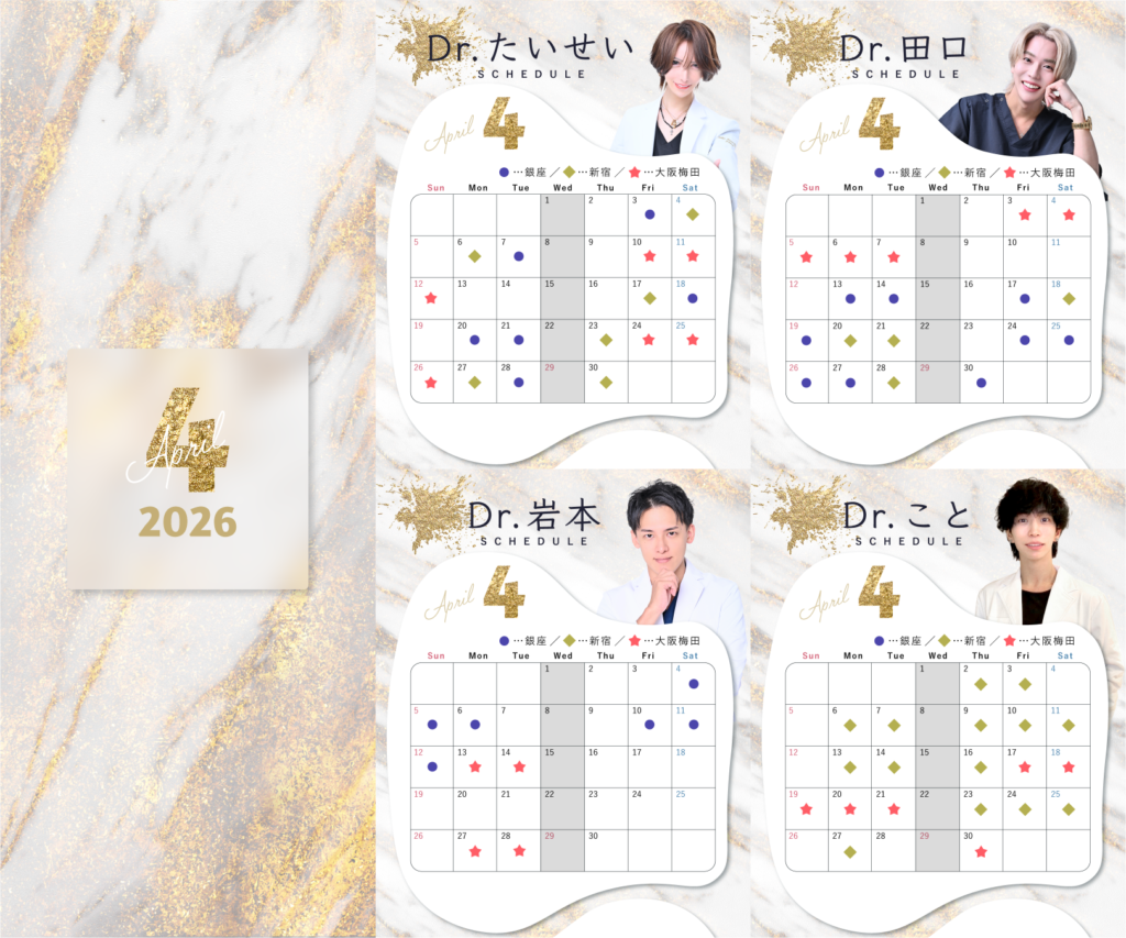 4月ドクターカレンダー更新 \医師の4月出勤スケジュール/ 既にご予約をたくさんいただいております✨ 毎年大変混み合う時期ですのでお早めにお問い合わせくださいませ。沢山のご予約お待ちしております。 ※急な会議や出張・撮影などで予定が変更になることがございます。